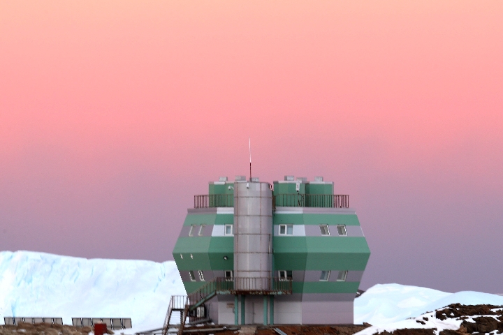 10、中山站(69°22'S,76°22'E)的標志性建筑“六角樓”(高空物理觀測棟)。今年是中山站建站30周年,經過30年建設,中山站已成為中國規模最大的南極科考基地。↓