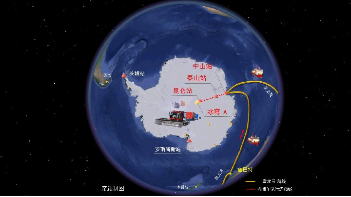 科考隊員除了搭乘“雪龍”號進行大洋科考、用“雪鷹601”固定翼飛機展開航空科考之外,也在中山站、泰山站、昆侖站等廣袤的南極冰雪大陸上展開了科學考察。其中,從中山站到南極冰蓋之巔冰穹A,是中國科考隊開辟出的一條著名的“冰雪之路”。