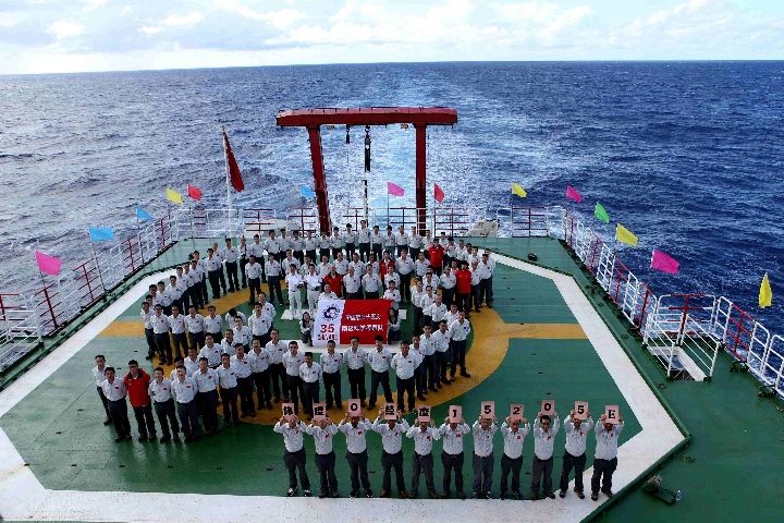 2、11月9日,“雪龍”號穿越赤道,開始在南太平洋航行,科考隊員組成南極圖案的隊形合影留念。↓
