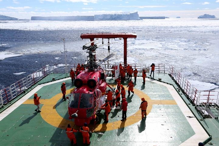 7、11月29日,“雪龍”號穿越南緯66度33分,進入南極圈,科考隊直升機組進行卸貨前相關準備。↓