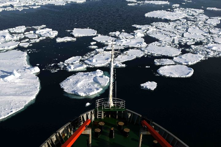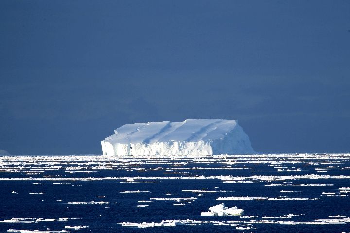 6、11月25日,“雪龍”號駛入南緯61度55分、東經110度37分的浮冰區。浮冰鋪滿海面,時有冰山立于其間。↓