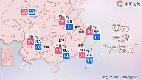 后天南方開始降溫,到22日不少地方的最高氣溫將遭“腰斬”,局地降幅甚至接近20℃。例如杭州,周三最高氣溫或達30℃,你可能需要穿短袖,但到了周五,最高氣溫只有11℃,還下著小雨,這時候就得裹棉襖出門了。三天之內由“夏”到“冬”,大家一定要注意根據天氣變化及時增減衣物,謹防感冒。