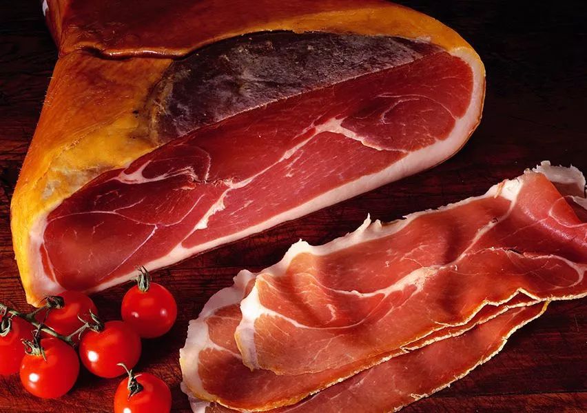 △帕爾瑪火腿,世界最著名的生火腿之一,其色澤嫩紅,脂肪分布均勻,口感于各種火腿中最為柔軟。