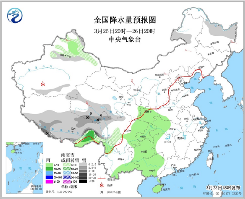 3月23日20時至24日20時,新疆西部山區(qū)、西藏北部和東部、內(nèi)蒙古東北部、黑龍江西北部和中部、甘肅中部、青海南部和東部、寧夏中部、川西高原等地部分地區(qū)有小雪或雨夾雪。江南南部、華南大部和南部等地部分地區(qū)有中到大雨,其中廣西東部、廣東中部、海南中部等地局部有暴雨(50~79毫米)。新疆西北部、內(nèi)蒙古中東部、青海東北部、西藏大部、山西北部、遼東半島、山東半島等地部分地區(qū)有4~6級及以上風(fēng),其中西藏部分地區(qū)有6~7級風(fēng)。新疆南疆盆地有揚沙或浮塵天氣。(見圖1)。臺灣海峽、南海東北部等地將有8級風(fēng),陣風(fēng)9~10級。