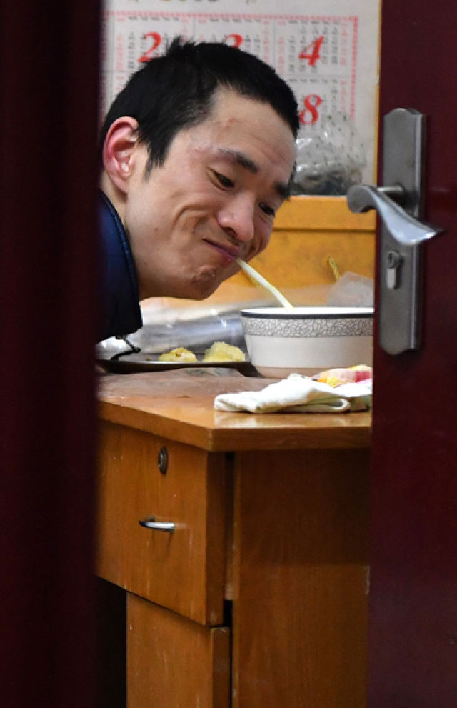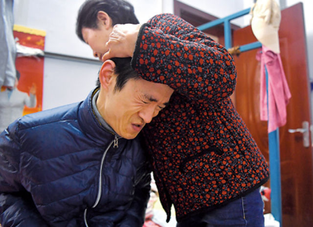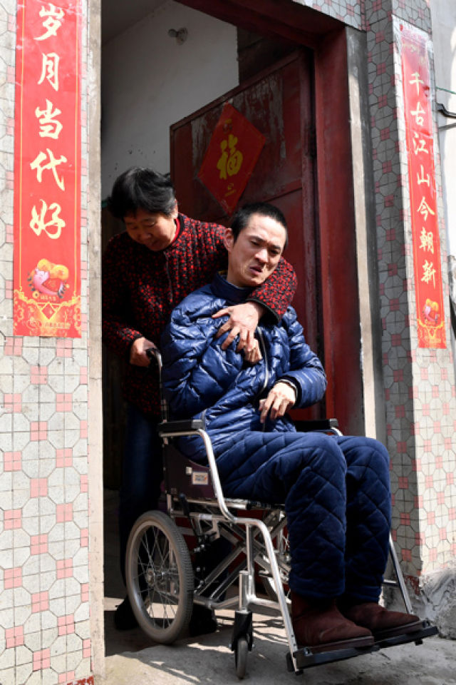 陳偉起的母親在幫助陳偉起起床。(3月6日攝)