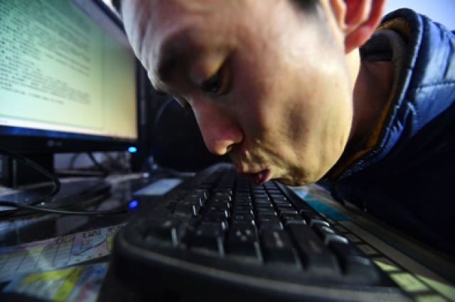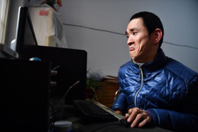 這就是記者最初見到他時的樣子——像個小雞一樣在“啄”鍵盤。他形容自己是一個“用舌尖行走”的人。“不過‘啃’鍵盤的打字速度比不上雙手,時間長了,脖子跟脊背連接處也酸痛得厲害?!标悅テ鹫f。