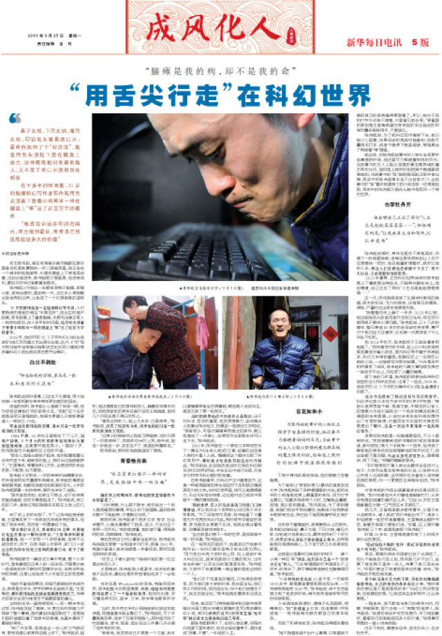 在十多年的時間里,35歲的腦癱科幻寫作者陳偉起用舌尖頂著下唇像小雞啄米一樣在鍵盤上“啄”出了近百萬字的著作