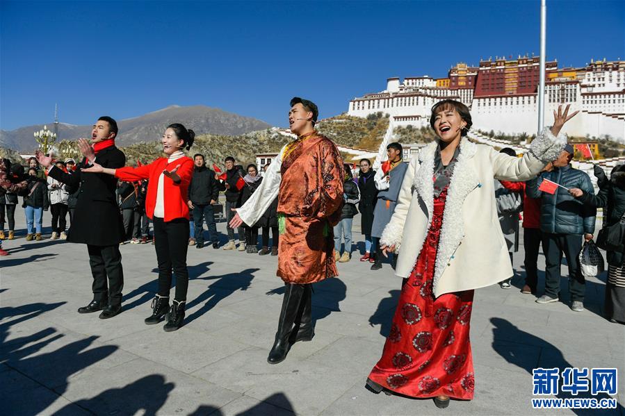 2018年12月31日,演員在布達拉宮廣場的快閃活動中演唱《我和我的祖國》。 新華社記者 劉東君攝