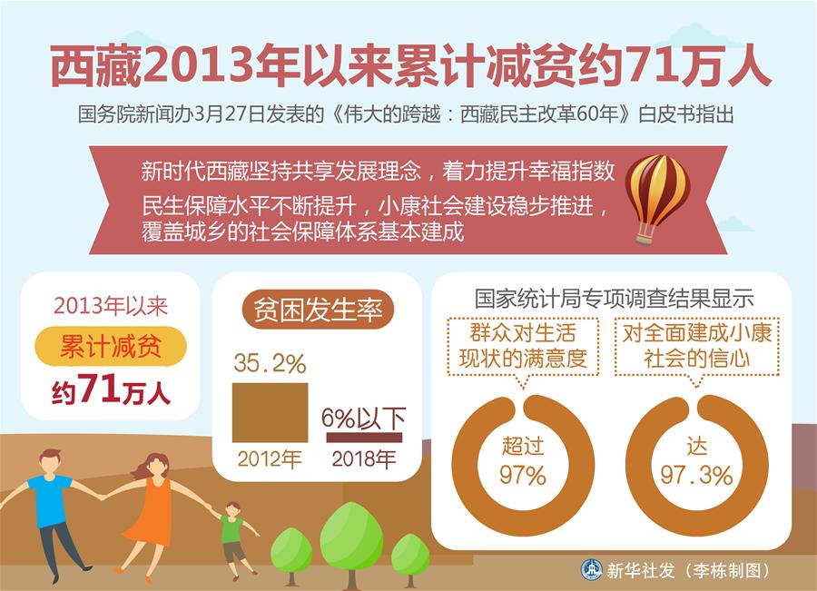 白皮書指出,新時代西藏堅持共享發展理念,著力提升幸福指數。民生保障水平不斷提升,小康社會建設穩步推進,覆蓋城鄉的社會保障體系基本建成。2013年以來,累計減貧約71萬人。貧困發生率由2012年的35.2%下降到2018年的6%以下。國家統計局專項調查結果顯示,群眾對生活現狀的滿意度超過97%,對全面建成小康社會的信心達97.3%。