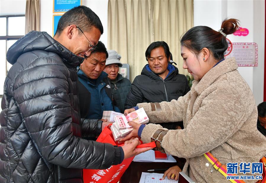 在分紅大會上,蔡公堂鄉白定村村委會代表(左)領取村集體分紅款(1月22日攝)。新華社記者 張汝鋒 攝