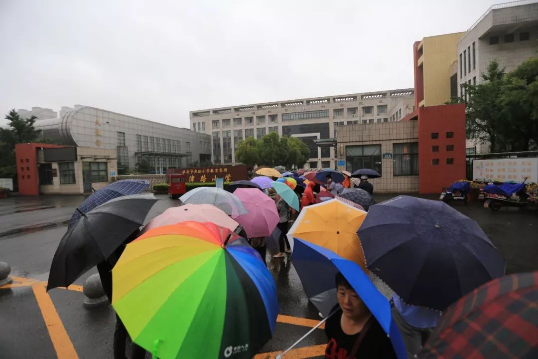 △2018年7月5日,江蘇淮安,冒雨為孩子報名的家長。