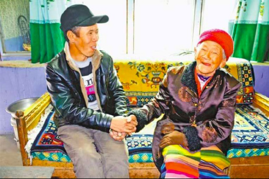 次仁卓嘎老人(右)和兒子次仁多吉聊天。資料圖