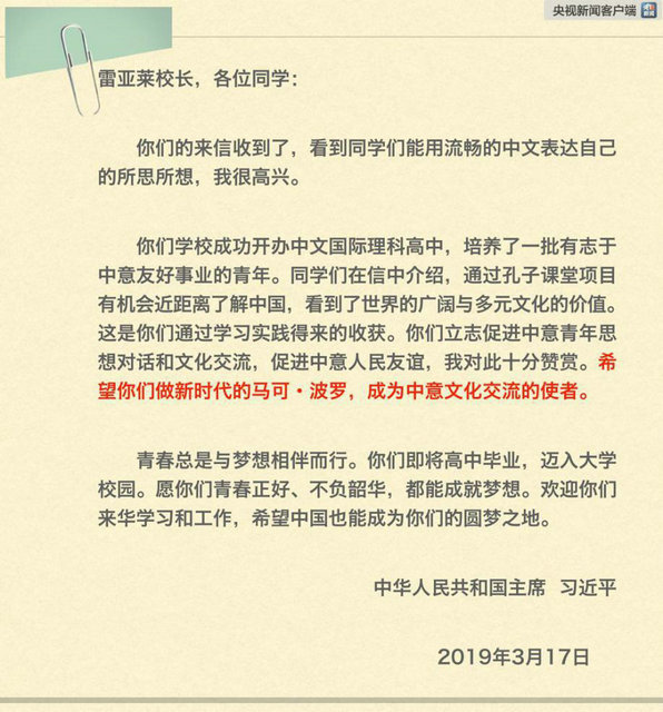 出訪前夕,習近平回信勉勵用中文給他寫信的意大利學生,希望他們做新時代的馬可·波羅,成為中意文化交流的使者。