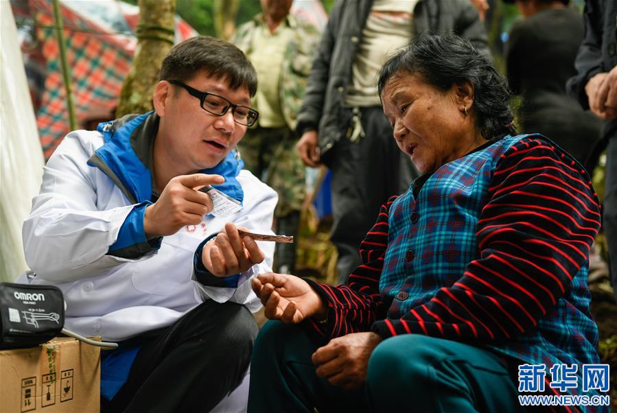 2018年10月22日,廣東中山大學附屬第一醫院援藏林芝市人民醫院的副主任醫師李振宇(左)在墨脫縣墨脫鎮瑪迪村臨時救災安置點為群眾進行健康巡診。新華社記者 劉東君攝