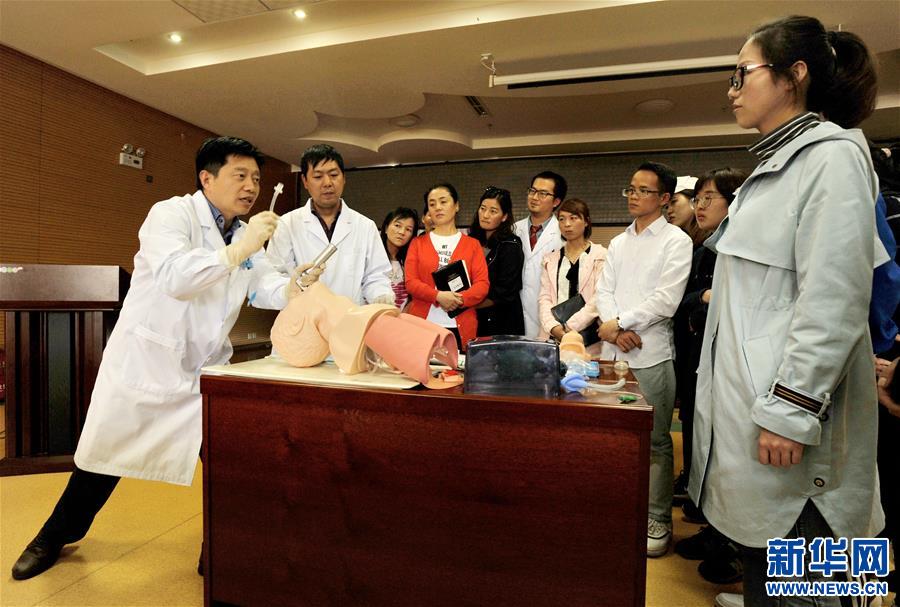 在林芝市人民醫院白求恩大講堂,林芝市人民醫院院長、來自廣東省人民醫院的援藏專家李欣(左一)為年輕醫生示范氣管插管技術(2018年8月16日攝)。新華社記者 張汝鋒 攝