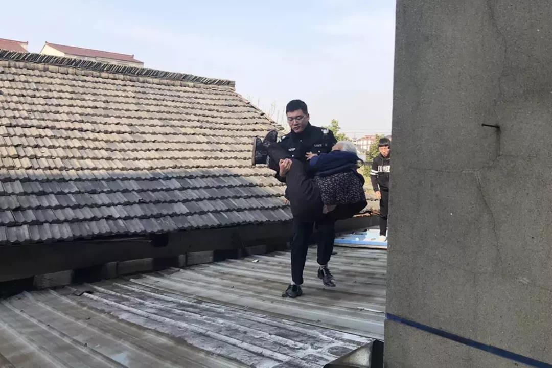 為了防止帶回過程中因為老太太情緒不穩而引發意外,沉著冷靜的徐嘉豪,將老太太一把抱起,以“公主抱”的形式將快速將老人平安抱下頂棚,將老太太平安送到房屋內后,徐嘉豪又轉身攙扶幫助另一位大媽回到房中。