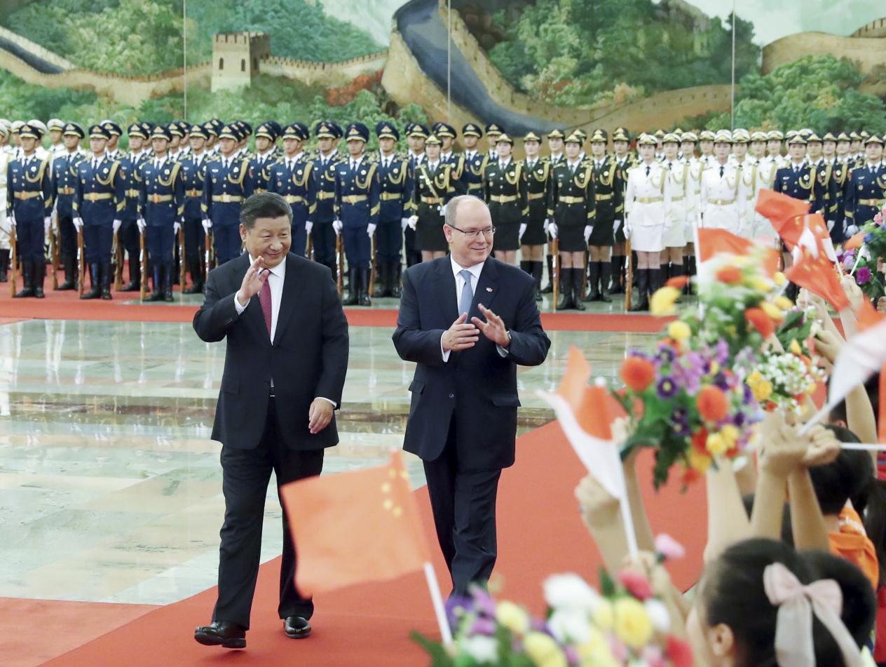 2018年9月7日,國家主席習近平在北京人民大會堂同摩納哥元首阿爾貝二世親王舉行會談。這是會談前,習近平在人民大會堂北大廳為阿爾貝二世舉行歡迎儀式。