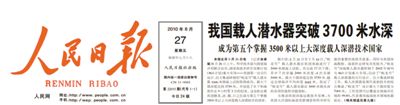 2010年8月27日,人民日報頭版刊發消息,宣布我國第一臺自主設計、自主集成研制的蛟龍號載人潛水器3000米級海上試驗取得成功(圖②)。當前,蛟龍號最大下潛深度7062米,工作范圍可覆蓋全球99.8%的海洋區域,標志著我國載人深潛科考已走在世界前列。