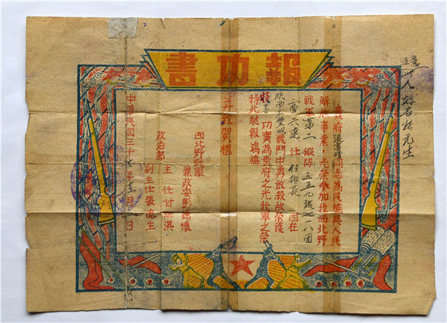 一份西北野戰軍的報功書,講述著張富清“因在陜西永豐城戰斗中勇敢殺敵”,榮獲特等功。