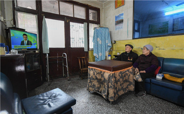 張富清和老伴在住了幾十年的老房子里看電視(3月31日攝)。新華社記者 程敏 攝