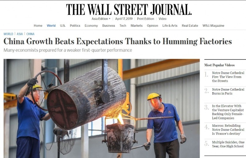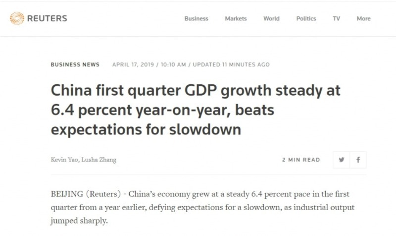 中國日報網4月17日電 國家統計局17日公布了2019年一季度中國經濟“成績單”。初步核算,一季度國內生產總值213433億元,按可比價格計算,同比增長6.4%。此前,市場普遍預期中國GDP增速為6.3%。外媒認為,中國經濟回暖速度超出市場預期,企穩跡象明顯。