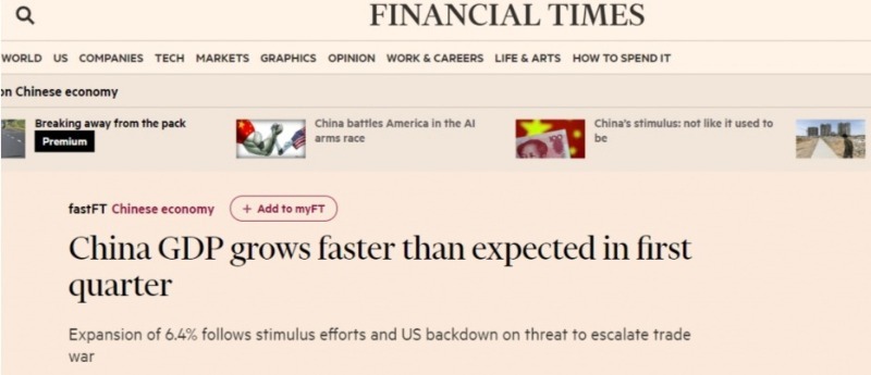 英國《金融時報》網站4月17日報道稱,中國國家統計局周三公布,今年第一季度,中國經濟同比增長6.4%,高于路透社預測的6.3%,這說明政府刺激措施開始生效。