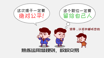 權權交易特別體現在選人用人方面,能通過看似合法的程序,使德才平平、能力一般,卻有“特殊背景”的人,在仕途上扶搖直上。