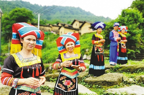 上林縣鼓鳴寨景區(qū),穿著壯族傳統(tǒng)服裝的村民正在迎接游客。