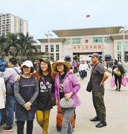 中越友誼大橋上,赴越南一日游的游客在合影留念。