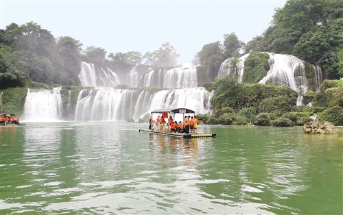 中越邊境線上的德天跨國瀑布寬308米,三級落差70米,縱深60米。圖為游客在觀賞瀑布美景。