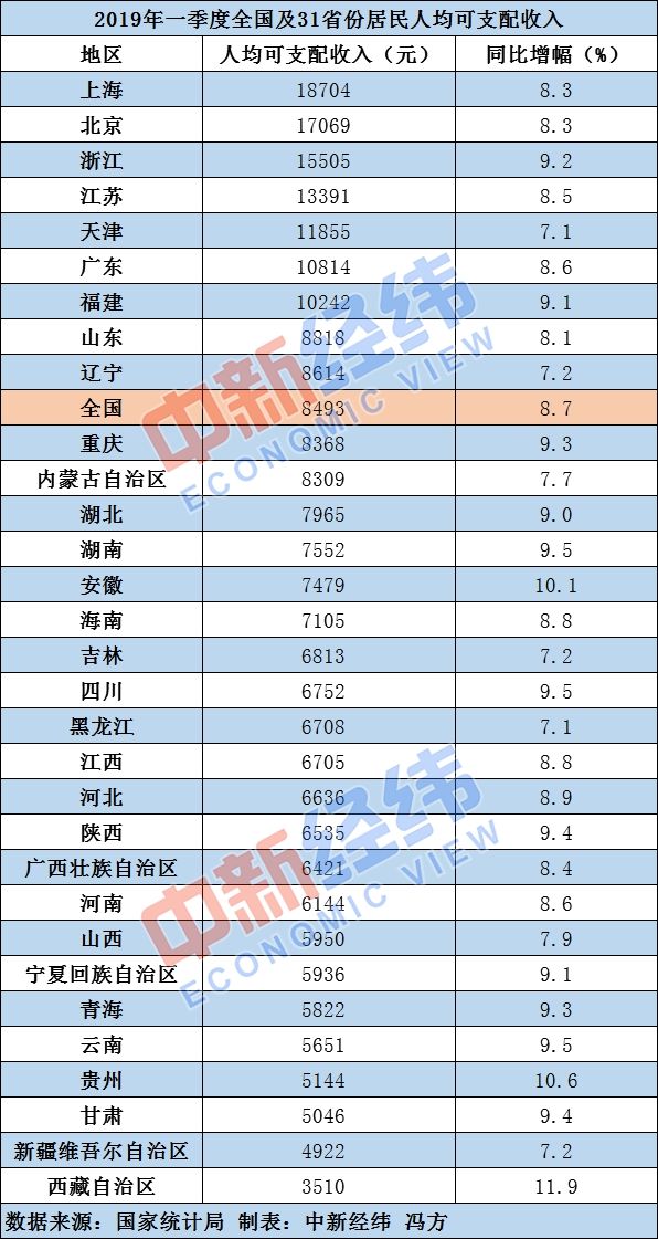 近日,國家統(tǒng)計(jì)局陸續(xù)公布2019年一季度全國及各省居民人均可支配收入數(shù)據(jù)。數(shù)據(jù)顯示,一季度全國居民人均可支配收入為8493元,比上年同期名義增長8.7%,扣除價(jià)格因素后實(shí)際增長6.8%。