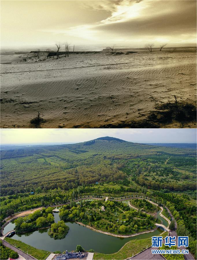 拼版照片:上圖為治理前,山西朔州市右玉縣的荒涼沙地(資料照片);下圖為右玉縣小南山森林公園(新華社記者曹陽2018年8月7日攝)。右玉縣林木綠化率從1976年的12.66%增至2017年的54%,在黃土高原上樹起一道綠色豐碑。 新華社發