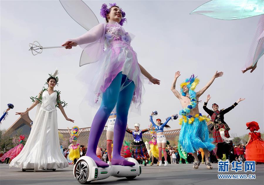 4月29日,在北京世園會中國館前,演員在花車巡游中表演。 新華社記者 王毓國 攝