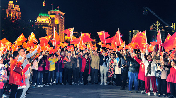 昆曲藝術(shù)家張軍、新聞主播葉蓉、和平飯店爵士樂隊、黃浦區(qū)勞模代表、春天少年合唱團的少年們……出人意料地閃現(xiàn)在人流如梭的外灘,用不同的方式唱響《我和我的祖國》。外灘成了一片紅色的歡樂海洋:輪滑少年手執(zhí)國旗在人群前滑過,江邊和浦江游輪上的人們興奮地互相舞動著國旗,鐘樓在燈光投射下“身披”一面巨型國旗……越來越多的游人圍聚過來跟著一起高歌,人們拿出手機記錄下這一特別的時刻。歌曲結(jié)束時,歡呼聲響徹外灘。“我愛中國,我愛上?!保⒆觽?nèi)杠S高呼。