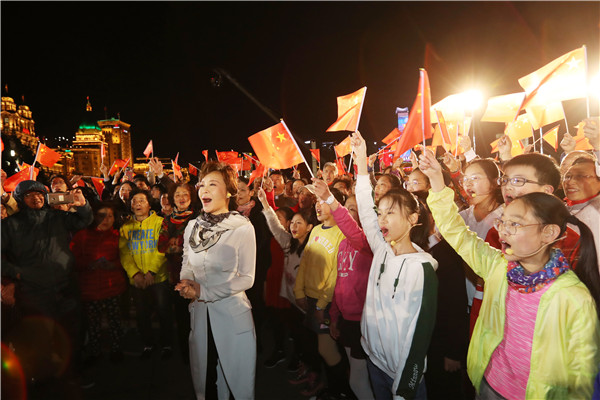 快閃現(xiàn)場,觀眾們激動地揮動國旗。