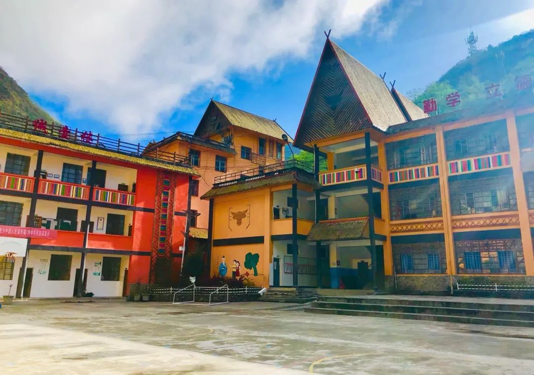 彩虹色條紋裝飾的教學樓、木質茅草尖頂、隨處可見的獨龍牛頭像
