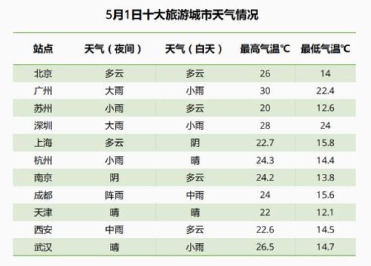 中國天氣網數據顯示,廣州、北京、蘇州、深圳、上海、杭州、南京、成都、天津、西安十大“五一”熱門旅游城市中,除北京、南京、天津外,其他七個城市或將有降雨。