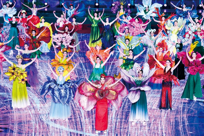 2019年4月28日,世界園藝博覽會開幕式在北京延慶舉行。在以“美麗家園”為主題的文藝晚會上,中國古典舞《彩蝶的虹橋》,以翩翩起舞的蝴蝶展現了大自然的五彩斑斕。各國模特身著參展國的名花圖案服飾,用五彩繽紛的花語共敘友誼。圖為演出現場。 新華社記者 申宏/攝
