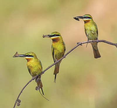 海南省海口市五源河國家濕地公園,三只栗喉蜂虎駐足枝頭。