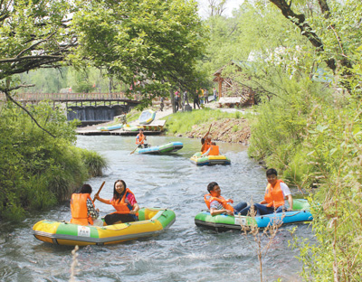 游客在露水河國家森林公園內體驗漂流樂趣。