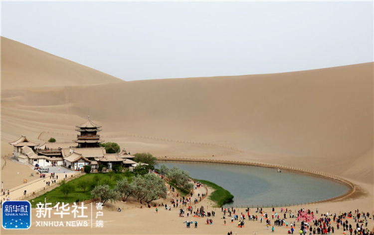 ↑5月2日,游人在甘肅省敦煌市鳴沙山月牙泉景區游覽。新華社發(張曉亮 攝)