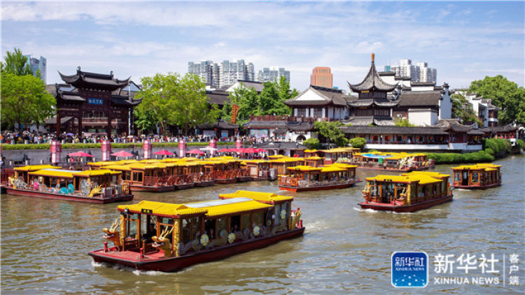 ↑5月2日,游人在南京夫子廟景區乘坐游船游覽。新華社發(蘇陽 攝)