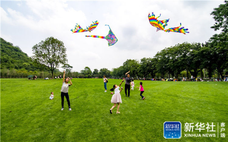 ↑5月1日,人們在廣西柳州市馬鹿山公園北側的草坪上玩耍。此處原為商業和商住用地,于2017年底轉為綠地使用,成為市民休閑的好出去。新華社記者 黃孝邦 攝