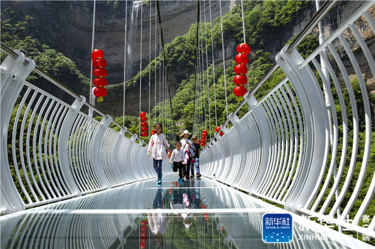 ↑5月2日,游人在湖北省宜昌市秭歸縣三峽竹海生態景區玻璃天橋上游玩。新華社發(王罡 攝)