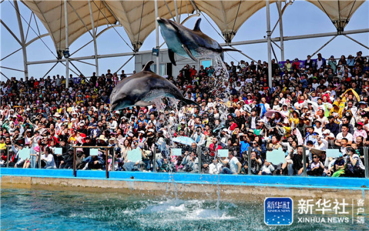 ↑5月2日,游人在位于河北省秦皇島市海港區的新澳海底世界觀看海豚表演。新華社發(曹建雄 攝)