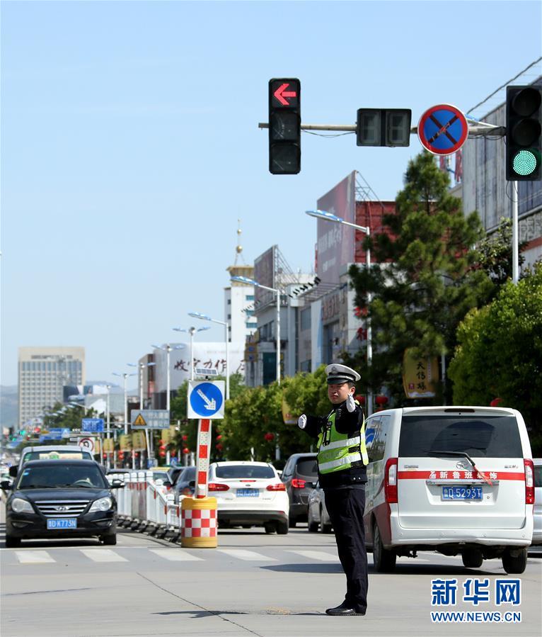5月1日,交警在山東省棗莊市文化路指揮交通。 當日是“五一”小長假第一天,各行各業都有依然忙于勞動的身影。 新華社發(孫中喆 攝)
