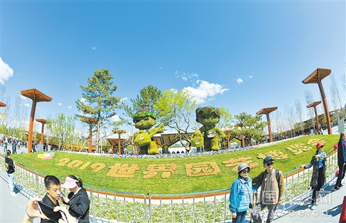 游客在北京世園會門前拍照留念。 經濟日報-中國經濟網記者 高興貴攝