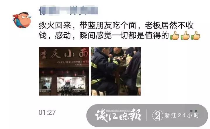 “救火回來,帶朋友吃個(gè)面,老板居然不收錢。感動(dòng),瞬間感覺一切都是值得的?!?/p>