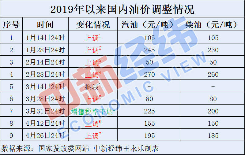 據記者統計,2019年以來,按照“十個工作日”一調整原則,國內成品油已調整8次。加上3月31日24時因增值稅率下調,國內成品油價格調整呈現“七漲一跌一擱淺”格局。具體來看,汽油累計上漲875元/噸;柴油累計上漲860元/噸。