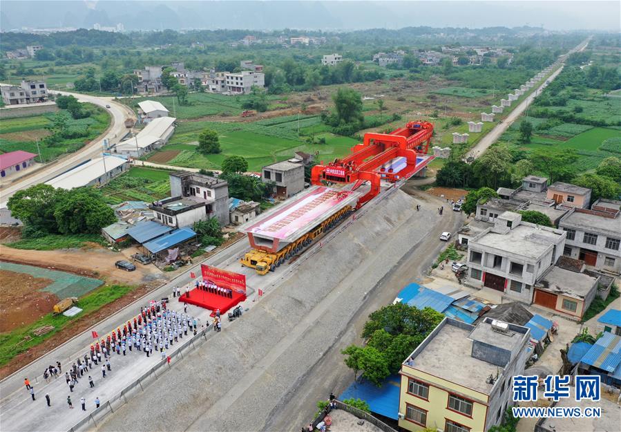 在廣西都安瑤族自治縣貴南高鐵澄江雙線特大橋施工現場,工人在架設大橋首榀箱梁(4月29日無人機拍攝)。 新華社記者 陸波岸 攝